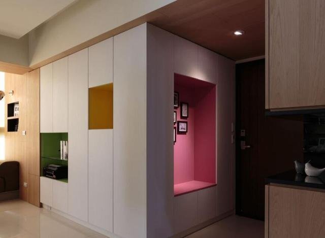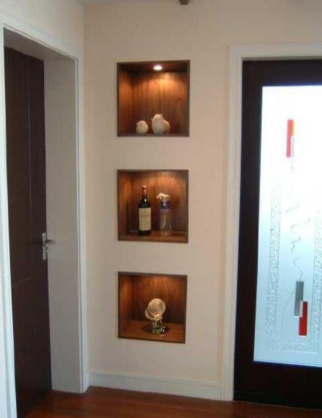 作為第一眼看到的地方,這里除了要保持干凈整潔更要彰顯家里的品味。而安裝幾個玄關(guān)柜不但占用空間還沒有任何裝飾性,不如學(xué)一下現(xiàn)在流行的這種設(shè)計。只需在墻面挖幾個洞再安上一些筒燈,擺上一些裝飾品或是私人藏品,這樣普通的一個小角落就能變得十分有品味。