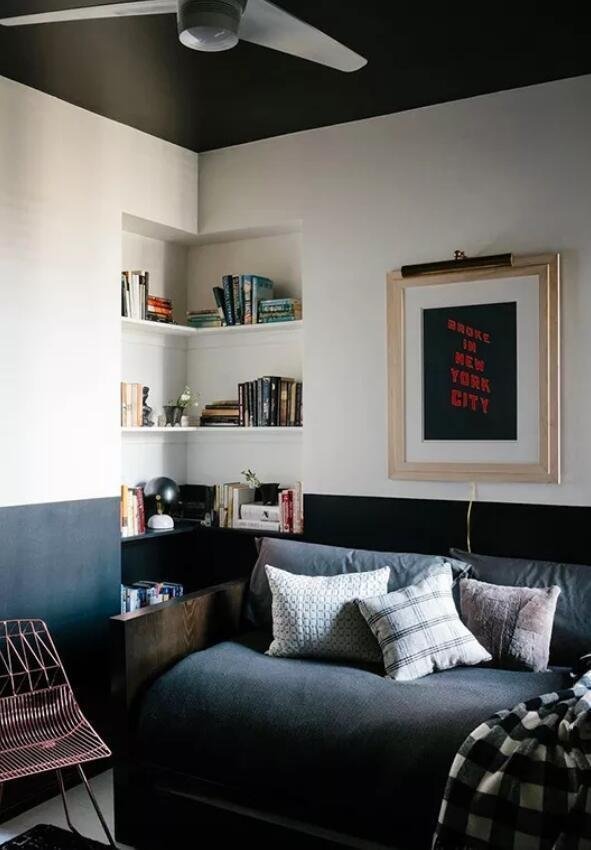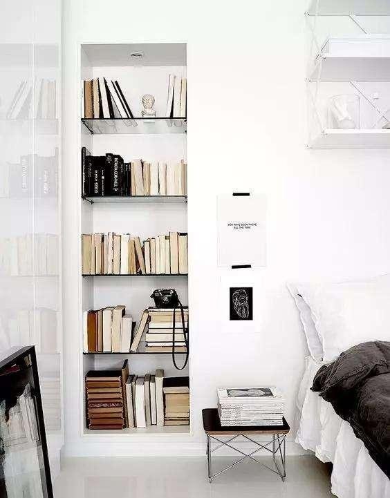 與其花錢買個書架不如做成這種嵌入式的書架。在墻面挖個洞放上一些層板看起來簡單但卻很實用,而且還能讓居室顯得更敞亮一些。