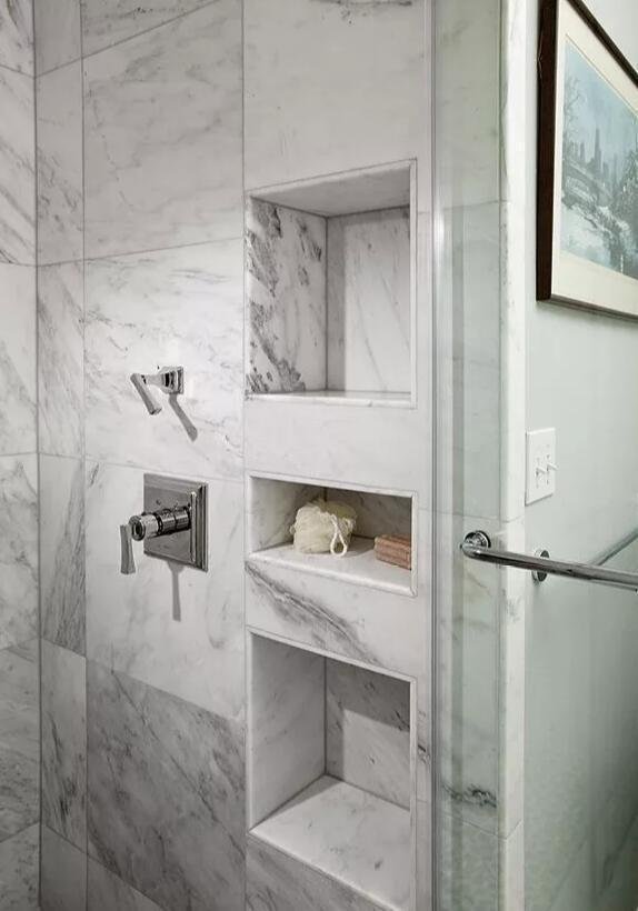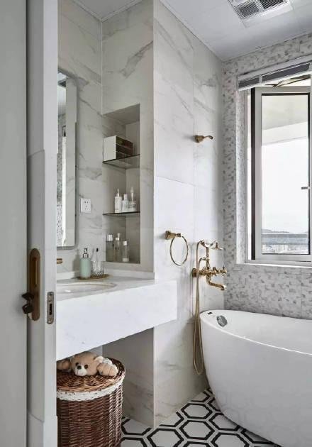 這個地方是最不適合買柜子了。由于這里的環(huán)境常年潮濕木制品很容易受潮變形,相比之下這種挖洞設(shè)計就顯得很實用。它即不易生銹變形而且打理起來也很方便。而除了淋浴區(qū)我們也可以在洗漱臺周圍或是如廁區(qū)做這樣的設(shè)計,不占空間拿取又方便。