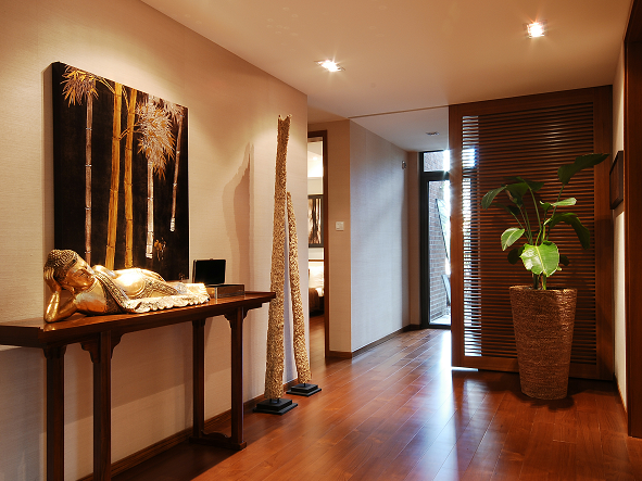 玄關(guān)的墻面也是設(shè)計(jì)的一個(gè)重點(diǎn),其墻面色調(diào)是視線最先接觸點(diǎn)。清爽的水湖藍(lán)、溫情的橙黃、浪漫的粉紫、淡雅的嫩綠,繽紛的色彩能帶給人不同的心境,也暗示著室內(nèi)空間的主色調(diào)。玄關(guān)的墻面最好以中性偏暖的色系為宜,能讓人很快從令人疲憊的外界環(huán)境體味到家的溫馨。